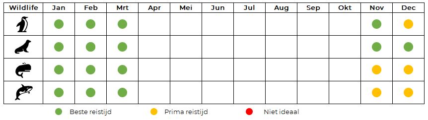 De meeste wildlife is te zien tussen eind december en februari, zoals pinguïns, zeeleeuwen en walvissen. Het broedseizoen van pinguïns is van november tot medio december. Vanaf eind december start januari komen al de eerste pinguïn chicks uit. Ook de zeeleeuwen zullen in deze periode pups krijgen. Februari en maart is de beste periode om walvissen en orka’s te zien.