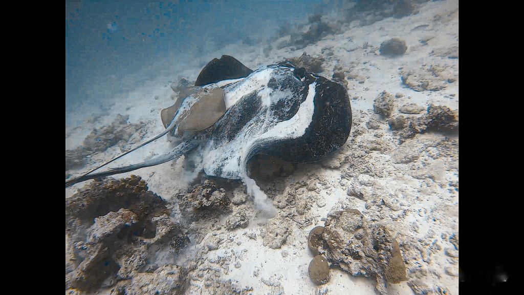 Coral Garden is een ondiep rif met kleurrijk koraal en tropische vissen. Hoogtepunten van onze duik waren een hengelaarsvis, koraalduivels, kreeft, octopus, en een megagrote pijlstaartrog met jonge!