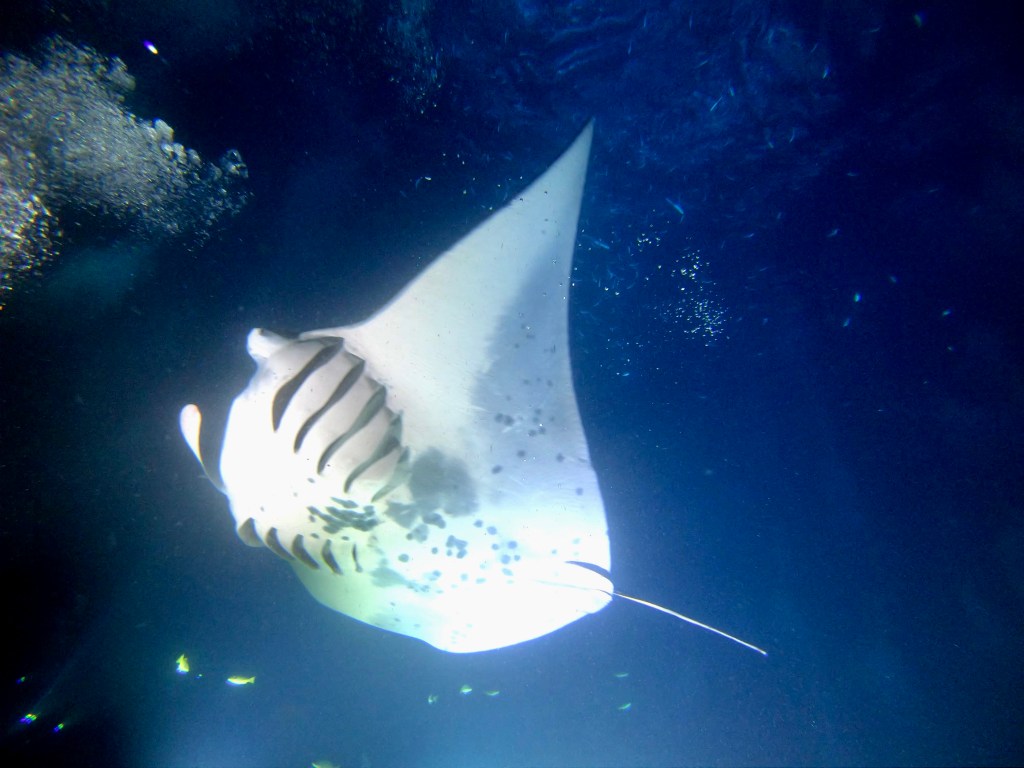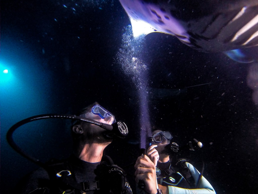 Dit was een van de mooiste duiken die we ooit gemaakt hebben. De manta roggen worden in de avond actief en gaan op zoek naar plankton. Als het donker wordt gaat de duik beginnen en zullen de duikinstructeurs lampen plaatsen om plankton aan te trekken. De gehele duik neem je plaats op de bodem van de zee. De manta roggen zweven net boven je hoofd en maken ze rondjes. We zagen gedurende onze duik elf manta roggen. We kozen voor een two-tank dive. We zagen zowel overdag als in de nacht manta roggen. Maar je hebt ook de keuze voor alleen één nachtduik.