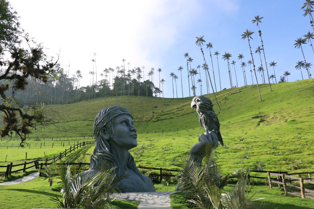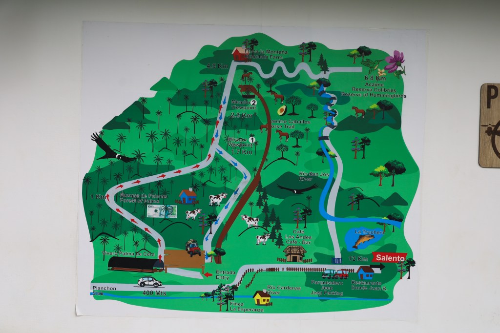 Vanuit de parkeerplaats wandel je over de onverharde weg langs verschillende restaurants en winkeltjes. Nadat je hier voorbij bent zie je aan de rechterkant een klein gebouwtje staan waar je de toegangsprijs moet betalen. Aan de zijkant van het gebouw vind je kaart met de routes. We besloten om eerst naar de standbeelden en het Cocora bord te lopen die rechts staan en daar wat foto’s te maken. Helemaal boven aan de top vind je een ‘hand’ met uitzicht over de waxpalmen, loop daar echter nog niet heen want die kun je makkelijk bereiken vanaf Mirador 1 Viewpoint, wat dus een stuk klimmen scheelt.