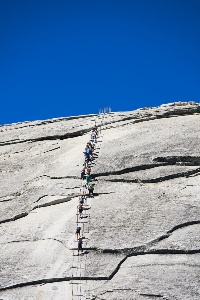 Half Dome, die ± 1500 meter boven Yosemite Valley en 2695 meter boven zeeniveau uitsteekt, is een iconische rots en een grote uitdaging voor veel wandelaars. De wandeling naar de top kent een hoogteverschil van 1463 meter. Onderweg heb je prachtig uitzicht op Vernal en Nevada Fall, Liberty Cap, Half Dome en Yosemite Valley. Mits de omstandigheden goed zijn hangen de kabels er vanaf de vrijdag vóór de laatste maandag in mei (Memorial Day) tot en met de tweede maandag in oktober. Permits zijn vereist voor Subdome en Half Dome. We hadden het geluk met het verkrijgen van een permit, voor meer informatie lees ons artikel Complete Gids: Hike naar Half Dome Yosemite National Park.