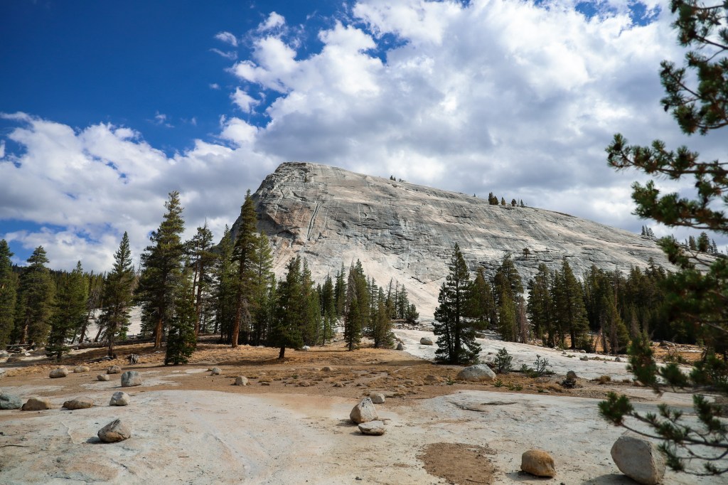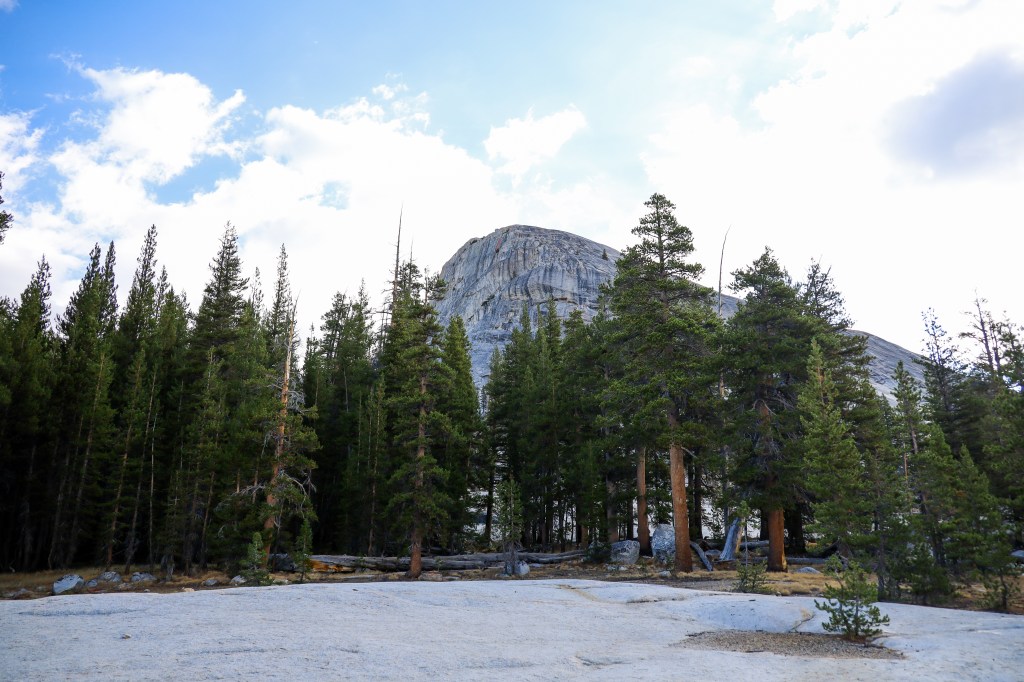 De route gaat door het bos naar de kale rots van Lembert Dome. Op de rots is geen route aangegeven, maar volg het eenvoudigste pad voor een panoramisch uitzicht op Toulumne Meadows en de omliggende toppen.