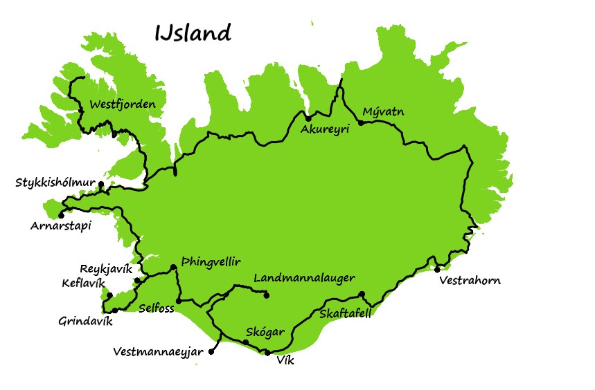 De kaart is de weergave van onze reisroute door IJsland in 14 dagen. De route doorkruist de Ring Road in de zomer. Voor een reisroute van 10 dagen, raden we aan om Vestmannaeyjar en de Westfjords over te slaan, en de Snæfellsnes peninsula in 1 dag te bezoeken. Voor een eerste bezoek aan IJsland maak gebruik van onze tips in het artikel Tips voor een onvergetelijke reis naar IJsland.
