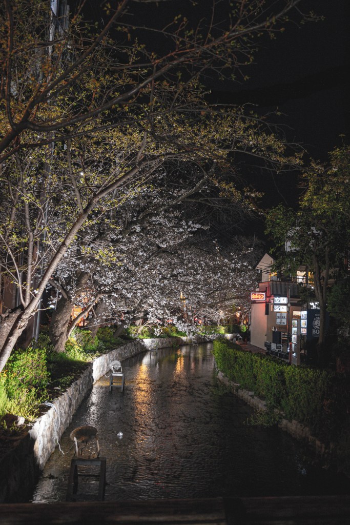 In de historische geishawijk van Kyoto is de kleine Tatsumi Bridge over het Shirakawa kanaal een van de mooiste plekken voor kersenbloesem in de stad. Het kanaal is omringd met wilgen en kersenbloesembomen, met traditionele houten theehuizen en met lantaarns verlichte straten.