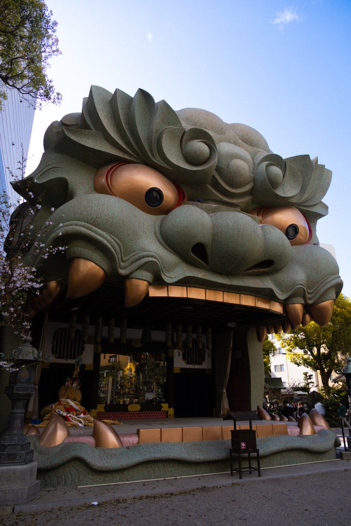 De Namba Yasaka Jinja is een tempel met een grote leeuwenkop van wel 12 meter hoog en 11 meter breed. De open mond van de leeuw zou boze geesten opslokken en geluk brengen, met name voor academische en zakelijk succes.